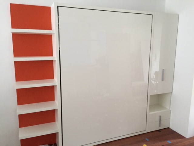 Deze particuliere klant heeft gekozen voor een subtiele maar mooie bedkastenwand van Clei. Bestaande uit een boiseriepaneel met legplanken, bedkast Penelope en nog een legkast element met laden en een open schap. Kleurstelling: Tibet Oranje als keus voor het boiserie paneel met mat witte legplanken, bedkast en de legkast zijn in melamine mat wit met hoogglans fronten.